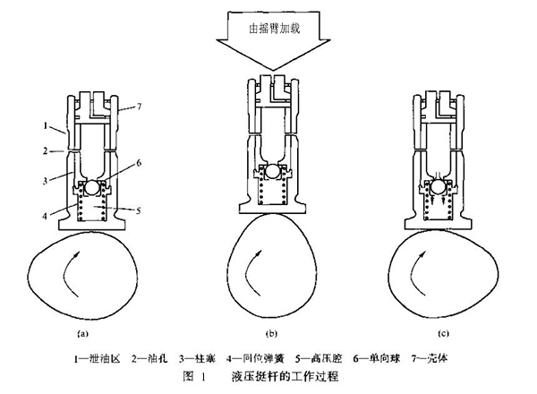凸輪凸部舉升之前的情況如圖1(a) 所示,在凸輪凸部開(kāi)始舉升之前,柱塞被內(nèi)部回位彈簧向上頂起。機(jī)油從挺桿腔流向凹進(jìn)部位,稱(chēng)為泄油區(qū);挺桿內(nèi)的機(jī)油壓力來(lái)自發(fā)動(dòng)機(jī)的潤(rùn)滑系統(tǒng)。此時(shí),高壓腔內(nèi)充滿了機(jī)油,氣門(mén)機(jī)構(gòu)中的所有間隙都被機(jī)油壓力消除。機(jī)油要通過(guò)單向球,此單向球只允許機(jī)油向一個(gè)方向通過(guò)。如果機(jī)油試圖從高壓進(jìn)人柱塞,將被單向球截止。一些挺桿采用單向閥而不是單向球,但原理是相同的。