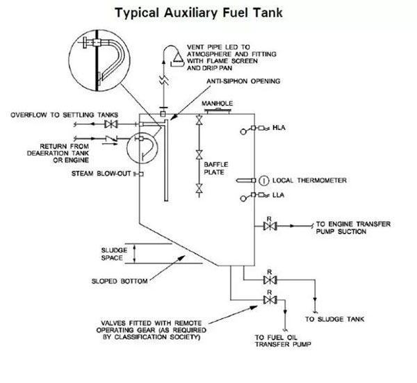 一般情況下室外油罐采用埋地式,依靠日用油箱與室外油罐之間的高差,可實現(xiàn)重力回油。